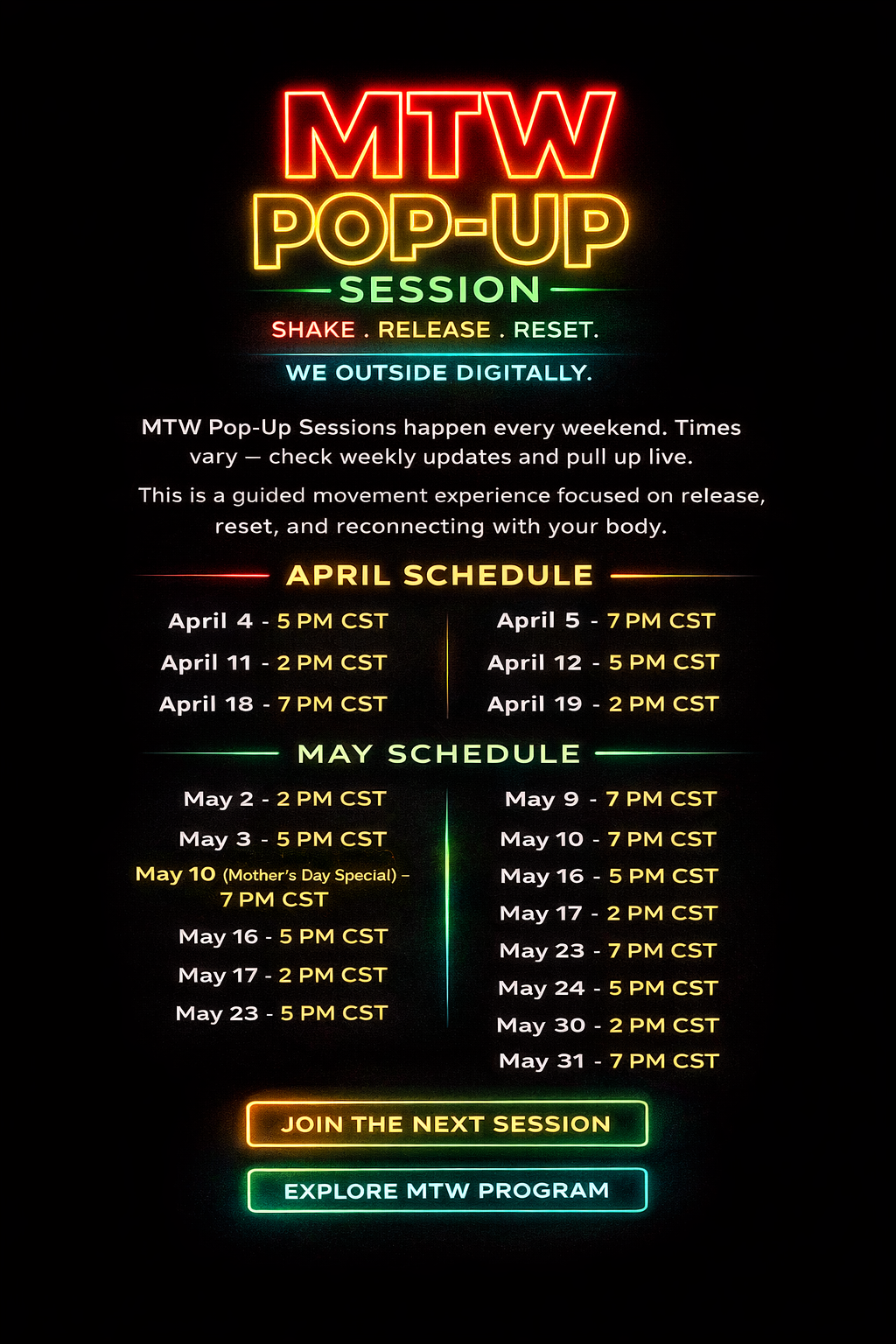 MTW Pop-Up Sessions are live, guided movement experiences designed to help you release, reset, and reconnect with your body in real time. We identify what we don’t want,